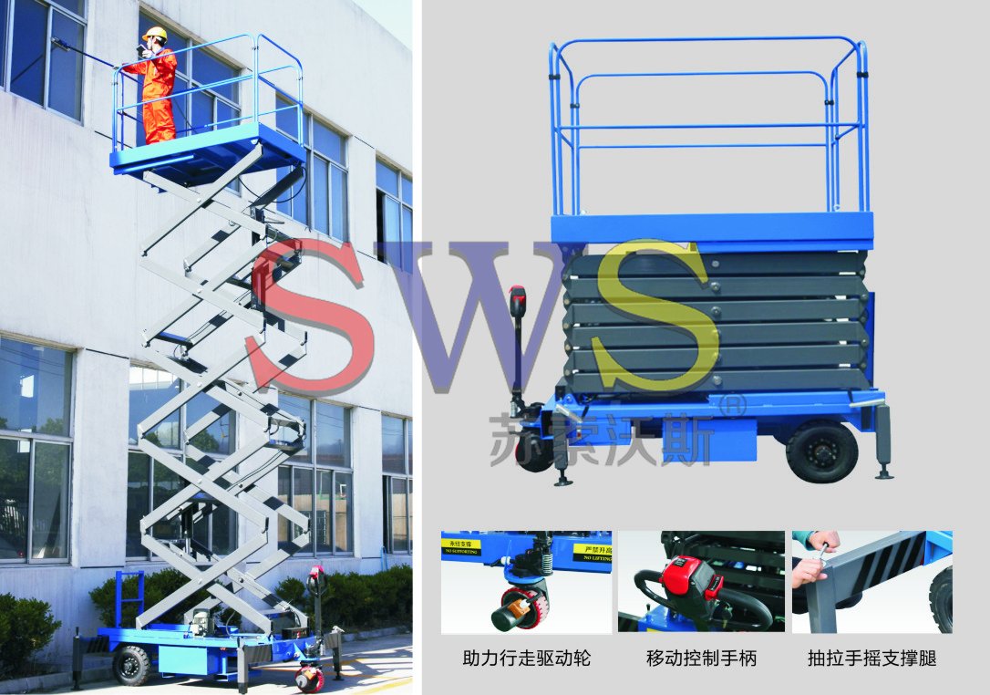 設備自身具有行走及轉向驅動功能,不需人工牽引,不需外接電源。移動靈活方便,直流電動驅動輪具有自鎖功能,驅動輪工作時剎車分離,不工作時自動鎖定。 令高空作業(yè)更方便快捷,是現(xiàn)代企業(yè)高效安全生產(chǎn)之 理想高空作業(yè)設備。